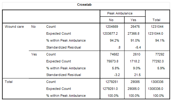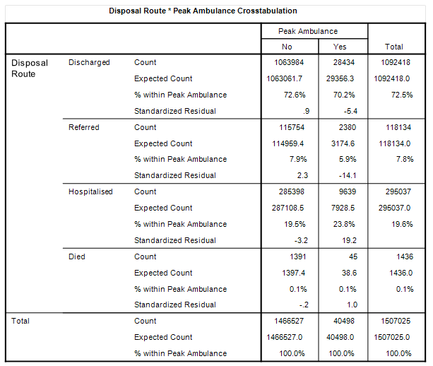 It was to be disposal route that tweeted a difference with a greater proportion requiring hospitalisation, and a lesser proportion being referred to a service provider at discharge. Herewith a slab of a table with all the gubbins: