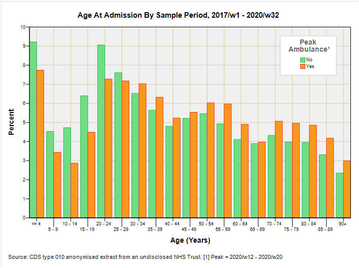 We observe a hospitalisation rate of 23.8% during that peak period for ambulance use compared to 19.5% when things are ‘normal’. We also observe a referral rate of 5.9% compared to 7.9%, the reluctance for which might be expected in the midst of a media frenzy, lockdown and service closure. Worthy of note are the identical death rates for those not making it beyond A&E so we’re not talking about anything lethal.