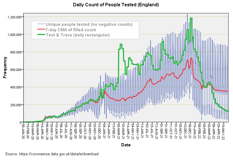 Here is the daily series derived from the UK GOV unique people series without the negative book keeping entries (blue line) together with a 7-day centred moving average for these daily counts (red line) with the England Test & Trace daily equivalent counts stuck on top (green line). They all start off in perfect agreement then, when repeat weekly testing of individuals kicks in, we see significant divergence between the two data sources with the UK GOV figures distinctly lacking in comparison to the England Test & Trace counts. Whoops! That March 2021 big green peak is also notably absent from the UK GOV data. Oh dear; it would seem we are not able to count people that well!