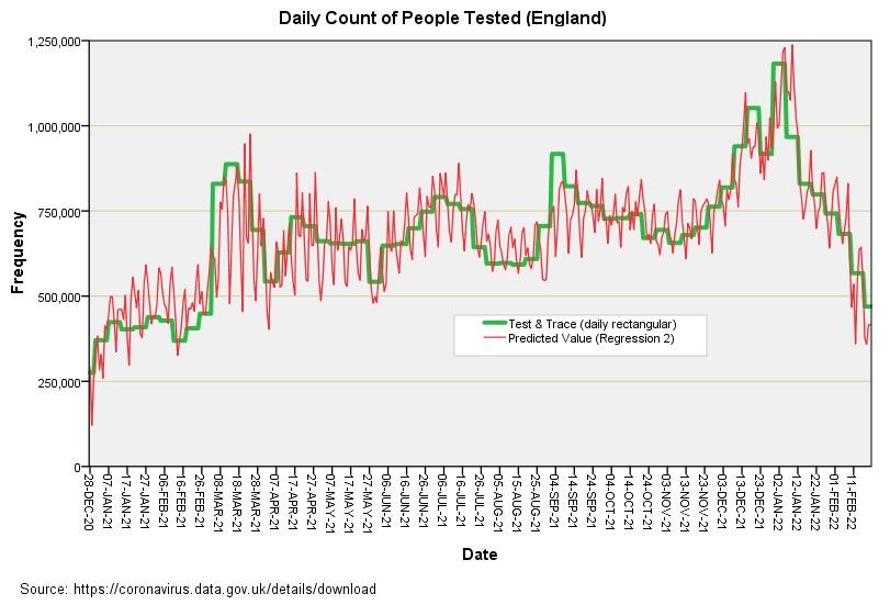 Indeed so, for I undertook some cheeky modelling along these lines back in July 2021, and under the heading ‘Is Viral Testing Churning Out Random Numbers?’ I revealed that 92.5% of the variation we see in case counts can be attributed to varying levels of viral testing alone. That statement caused quite a stir on facebook and so I may well repeat the exercise with fresh picked data.