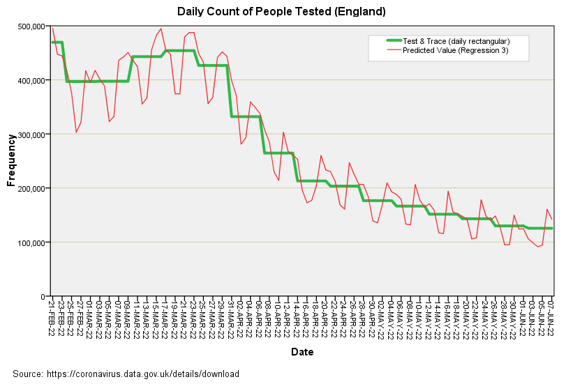 Once again I’m not going to present pages of statistical output and tests of model adequacy, and shall get straight to the point with a slide of observed Test & Trace daily counts of unique people tested over time and values predicted by generalised linear modelling (GLM), though I will mention that the adjusted R-square ended-up at a rather robust R2(adj) = 0.982. Here’s the proof of the pudding for the second time period: