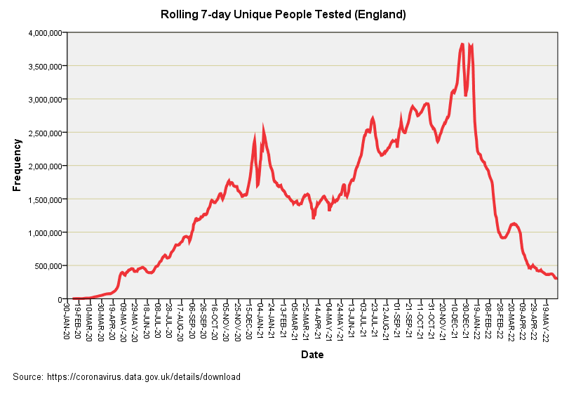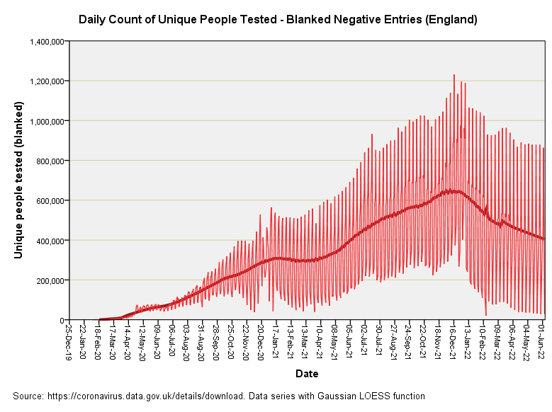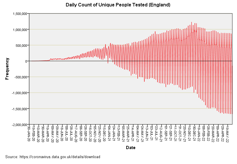 What I think is happening is that the dashboard team are not responsible for crunching the numbers, they simply throw them at the dashboard for public consumption. Somewhere down in the dungeons somebody has decided the easiest way to arrive at a figure for unique people tested for the previous accounting week is to derive a book-keeping entry every Monday that negates all the subsequent tests they have undertaken in the prior accounting period. Quite why they changed the system again on 21st Feb 2022 is beyond me unless book-keeping entries on a Tuesday help mop up any surplus.