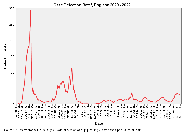 Note the footnote that states ‘derived from rolling 7-day counts’ this little trick is a favourite of the Office for National Statistics (ONS) since rolling 7-day counts iron out the strong weekly pattern of viral testing that otherwise introduces a lot of administrative noise.