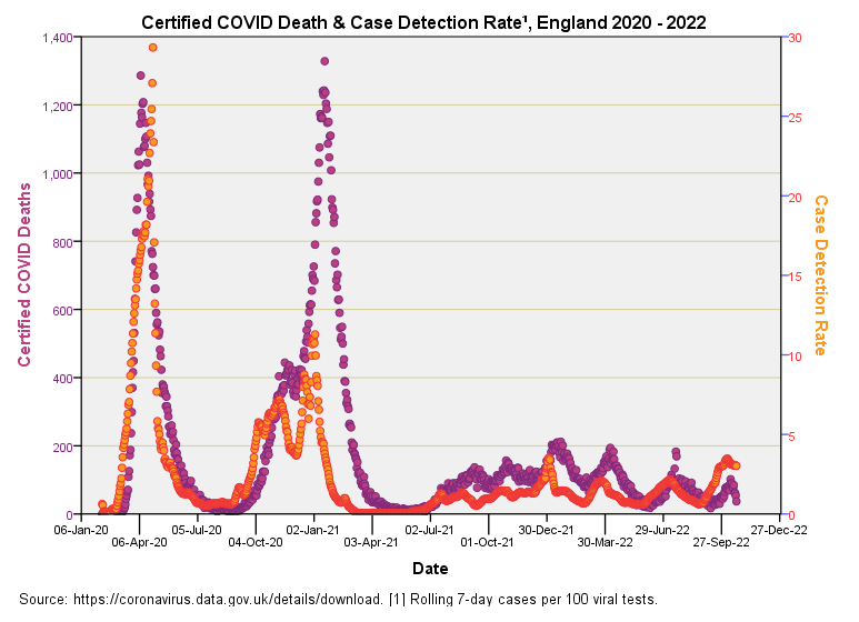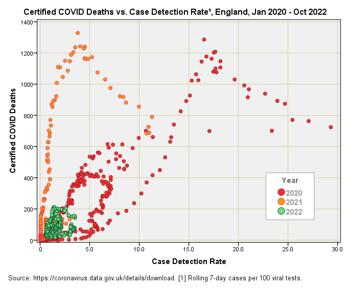 Now there’s a decent correlation right there (r = 0.688, p<0.001, n=987). During the first wave the pattern for incidence of certified death closely matches the pattern for CDR1, whereas during the second wave death eventually storms ahead of CDR, which remains low. This is intriguing for after January 2021 we see far more certified COVID death than we would expect from a consideration of disease prevalence, and this coming at a time when viral strains were getting weaker.