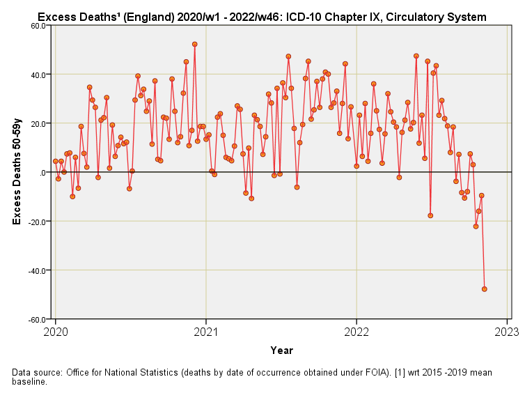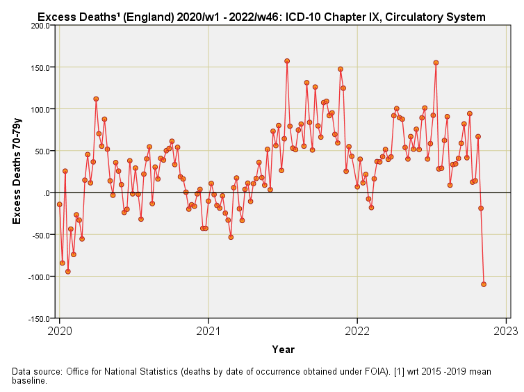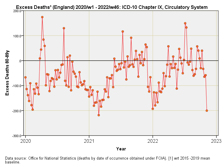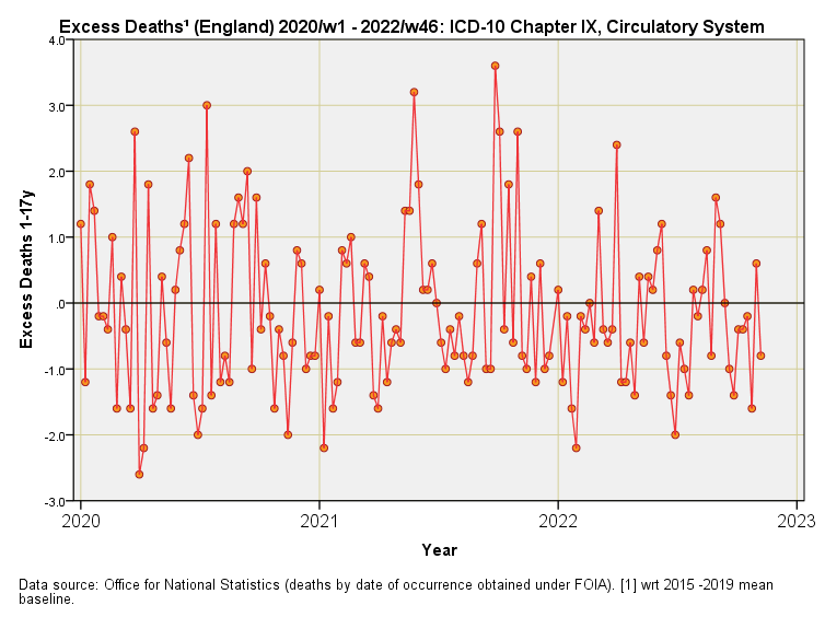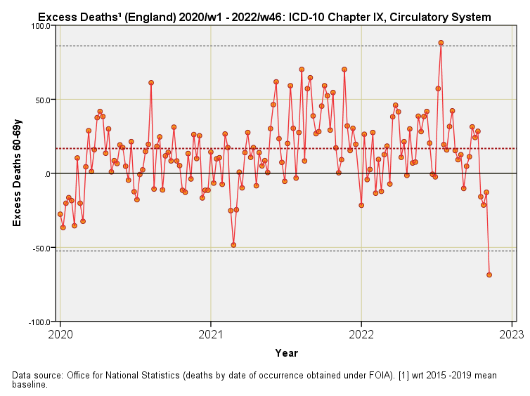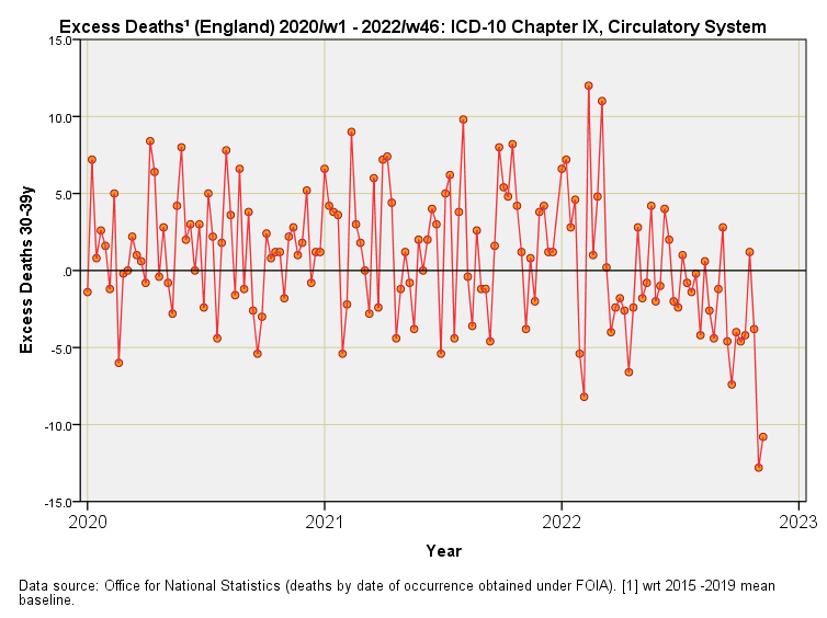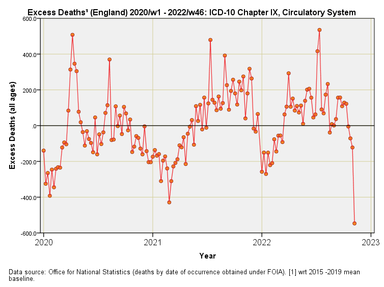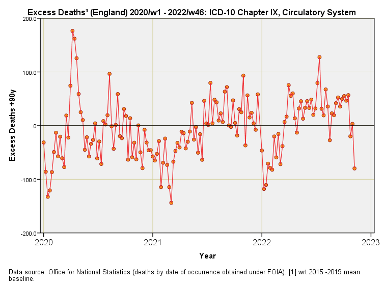 Statistical analysis of a dataset obtained under FOI by Joel Smalley. In this article I present excess deaths for ICD-10 chapter IX (I00 – I99): diseases of the circulatory system.