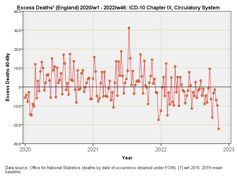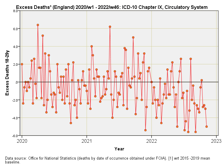 This time our eyeballs are support by the stats! The overall mean excess for 2020 – 2021 was -0.15 excess deaths per week compared to -1.76 deaths per week for 2022(p<0.001; ANOVA). Take a sheet of paper and hide the points for 2022, then hide the points for 2020 – 2021 and the difference is made obvious. This is an important finding for it means analysts should not be viewing this data as a homogeneous time series. If they do they’ll come to the fallacious conclusion that circulatory deaths for 18 – 29y are decreasing over time. Keep your beady eyes on how ONS and other ‘institutionalised experts’ handle this issue!