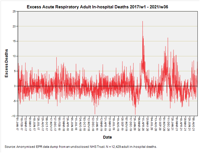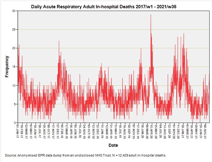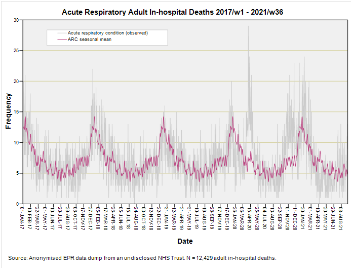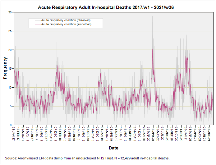 Here we have a time series plot of 12,429 adult in-hospital deaths with mention of acute respiratory conditions for the period 2017/w1 – 2021/w36. Please note that phrase ‘with mention of’; we’re not necessarily looking at cause of death for these cases could have recovered from their acute respiratory phase only to die of sepsis, liver failure, kidney failure, stroke or cardiac arrest.