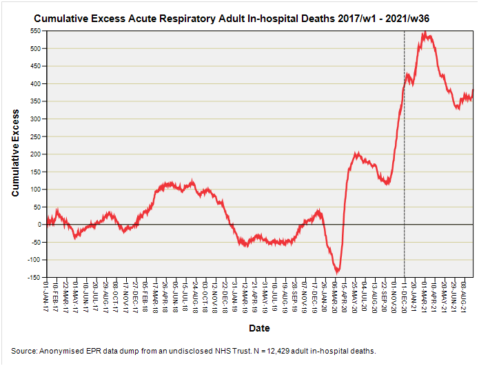 So here’s something I didn’t bank on – a sudden and sharp decline in cumulative excess deaths with mention of acute respiratory conditions just prior to the start of the pandemic. This leads straight in to the brick wall of sudden and certain death during the period I’ve labelled catastrophic health collapse. This strikes me as mighty odd - why would in-patients recovering from acute respiratory conditions one week to be plunged into a fatal epoch the next? Was something else going on that we should know about?
