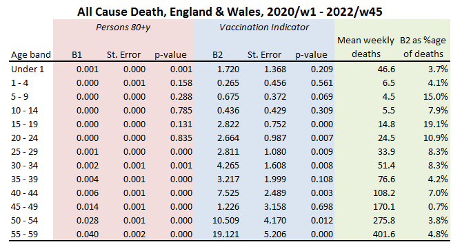 The area of interest for most folk will be the blue area, which provides the gubbins for the vaccine rollout indicator as a predictor for teenage death. The column to consider first and foremost is headed ‘p-value’, where we see a highly statistically significant effect suddenly kick in for persons 15 – 19y (p<0.001). The coefficient associated with this (B2) takes up a value of +2.8, indicating an elevation of nearly three extra deaths per week in the post-vaccine era. The column ‘mean weekly deaths’ gives the overall base rate for the entire series, this being 14.8 deaths per week for persons 15 – 19y, for which an excess of +2.8 yields a percentage leverage of +19.1%. That is some leverage that the authorities are studiously ignoring.