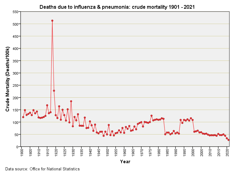 With the prologue ended and the scene set for our dramatical adventure into flu-flu-land I shall start by producing a slide of crude mortality (deaths per 100k population) for the period 1901 – 2021 for deaths due to influenza (ICD10 J09-J11) and pneumonia (ICD10 J12-J18) . This is based on an obscure dataset that some kind officer at the Office for National Statistics pointed in my general direction back in March 2021 (if anybody would like a copy please let me know):
