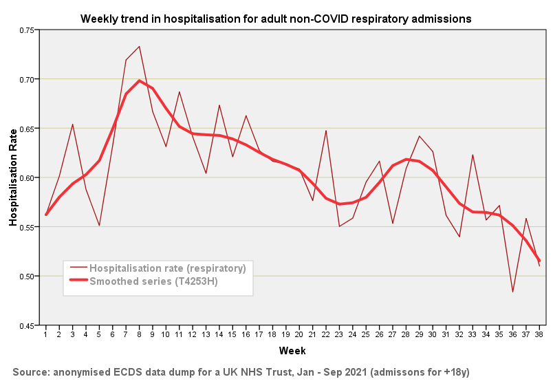 In this first slide we observe something odd with adult (>=18y) non-COVID respiratory admissions (acute and chronic) to the emergency department of a sizeable NHS Trust: numbers started to rise in a most unexpected fashion as we moved through spring and summer of 2021. This is the sort of curiosity that may be indicative of vaccine harm, though I don’t have historic data for comparison to thoroughly cross-check matters. Other explanations are possible but consider my eyebrow raised.