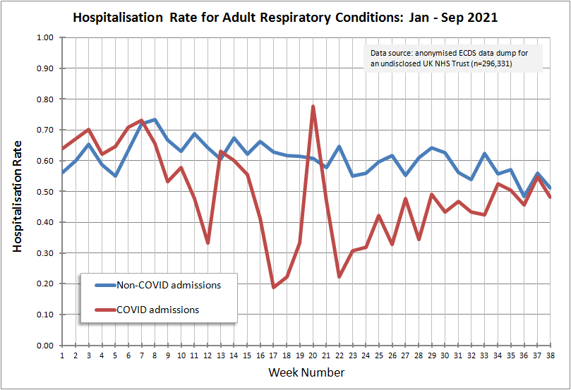 With these definitions in mind let us look at how the various different case types were treated in terms of weekly hospitalisation rate over the period Jan – Sep 2021, starting with a slide separating non-COVID respiratory admissions from COVID respiratory admissions and ignoring vaccination status.