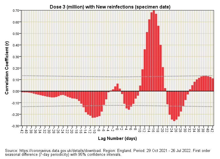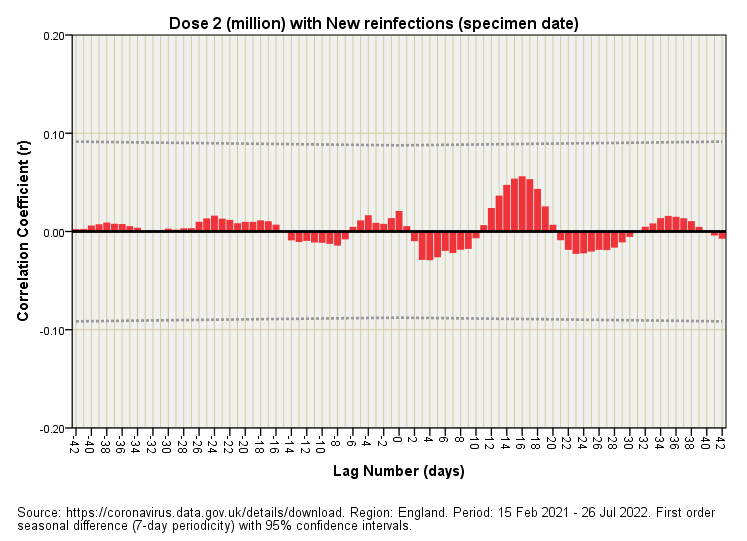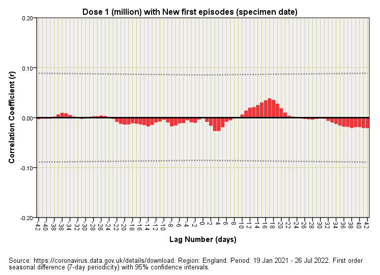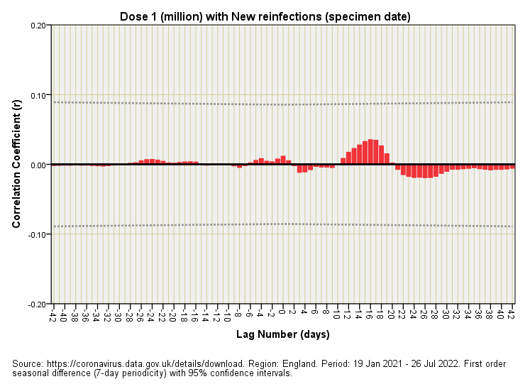 OK, so nothing here managed to reach statistical significance so we may be looking at random garbage. If we sort though that garbage we may spot a positive-going red hump centred on a lag of +17 days. This translates into a rise in COVID cases 17 days after initial dosing, the effect being persistent for both first episodes and new reinfections. It is this identically-lagged persistence across two categories of case that makes me think something genuine is going on despite statistical insignificance. At this point it is worth stopping for some cogitation.
