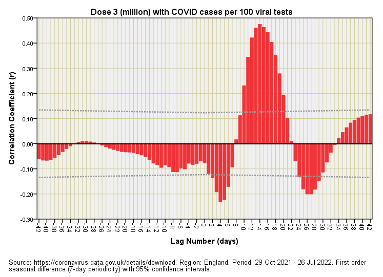Here’s the booster doing its positive-going, positive lag correlation mountain again, and yelling out “vaccine harm!” once more. A well-defined and statistically significant result such as this is hard to ignore and is unlikely to have been caused by wave interference amongst periodic variables. What we have here is fairly decent evidence of a rise in COVID cases around 2 weeks after receipt of the booster. We also have two blips of vaccine benefit at the 4-day and 4-week mark. A benefit after just 4 days is dubious to say the least, in which case how certain can we be of a similar benefit that appears at 4 weeks?