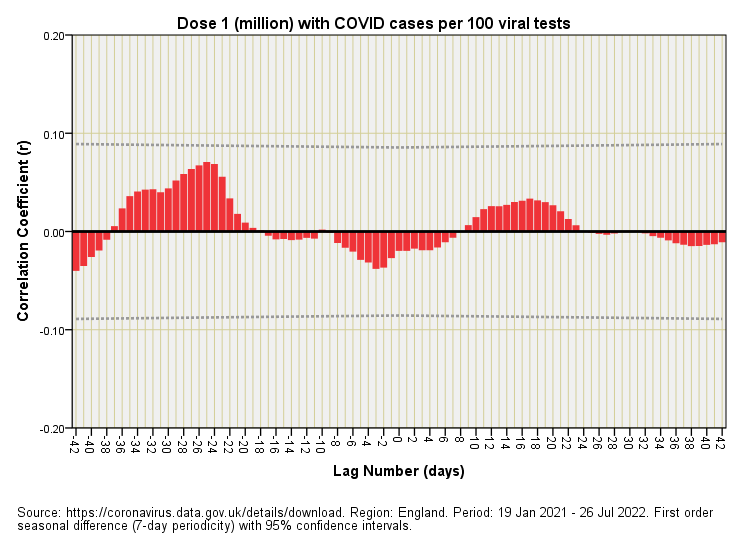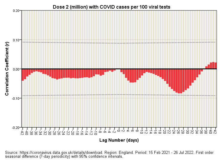 Again we find the CCF plot for the initial dose failing to produce time-lagged correlations that reach statistical significance. If we rummage once again in the garbage can associated with chance effects we find a palisade of negative correlations denoting potential vaccine benefit that straddle lag zero. This poses a causal dilemma in that benefit accrued both before and after inoculation, which is absurd. Either this is random garbage (that may still find its way into authoritarian reports) or claims of benefits following the first dose were illusory, this illusion being brought about by the clashing periodicity of viral tests, positive cases and doses administered. Those who enjoy cogitation may think about constructive and destructive interference of periodic variables. Those who do not enjoy cogitation this early in the morning may think about the phrase ‘a fluke result!’