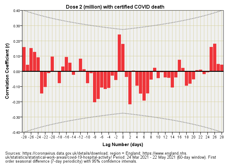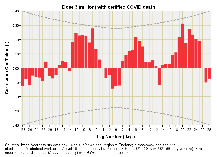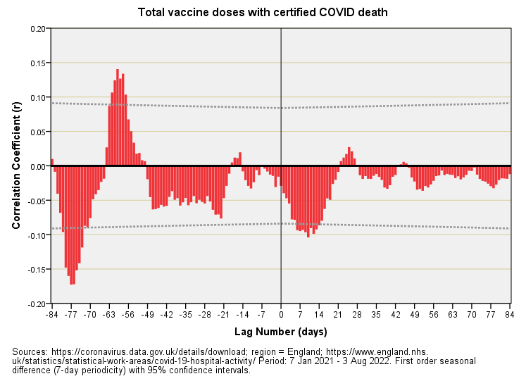 Taking everything at face value (and there’s a lot to take at face value) then we appear to have evidence of vaccine benefit that peaks at lag of 7 - 14 days before disappearing. If that is genuine benefit then it’s pretty short-lived. This feature is not alone, however, and we’ve got some retro-splaining to do. There’s a bunch of bars suggesting vaccine harm 8 - 9 weeks prior (certified deaths rising before vaccination doses rise) and there’s a bunch of bars suggesting vaccine benefit 11 weeks prior (certified deaths falling before vaccination doses rise). There’s no way these effects can be causal and so this must place doubt on the validity of the one result deemed to be causal. All bets are off, I’m afraid.