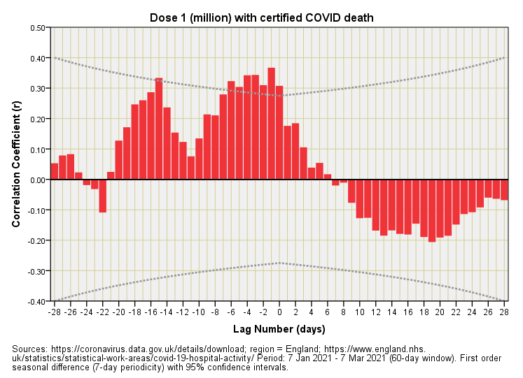 Now this is fascinating. We have some statistically significant positive correlations but they’re appearing at negative lags of between -1 and -6 days. Without knowing this we’d put this down to vaccine harm, but retrospective harm is physically impossible. Thus, I can only conclude that England witnessed a spate of certified COVID deaths just prior to vaccine roll-out. There’s no real sign of benefit but I shall be expanding the study since 60-day windows might isolate dosing effects but these are rather restrictive and reduce statistical power somewhat. Even then there will be confounding issues as we move from the peak winter season into spring: death rates reducing as doses settle is a recipe for an over-baked illusion!