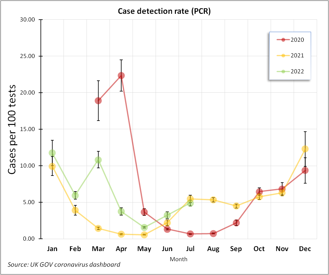 The case detection rates are affected by the games played with the cycle threshold and s gene dropout tricks for Omicron etc. The powers that be will argue we had more sensitive tests in 2021 and 2022. LOL.