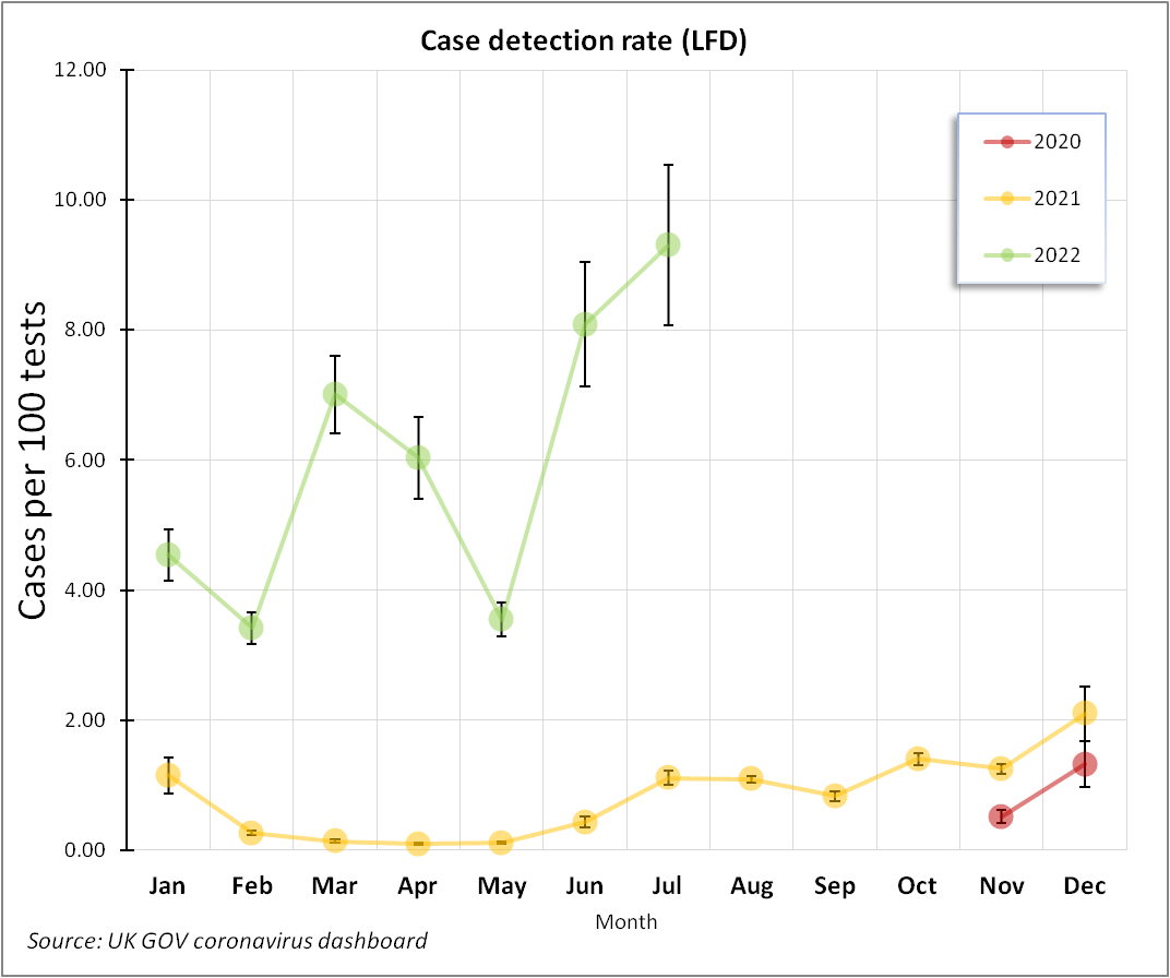 So let us start out this misty morning by addressing such numerical nonsense and by calculating something far more useful like the number of COVID cases per 100 viral tests. Let’s do this for PCR and LFD tests separately, and let’s break detection rates down by month and year into a series of easy to understand and colourful charts. There’s nowt more satisfying than getting your crayons out!