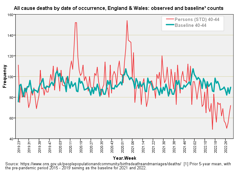 Once we get down to the 40 - 44y group we see a marked deviation between observed and expected counts from 2021/w51 onward. Given that the ONS updated these data on 23 November 2022 (week 47) then we may deduce processing delays of up to 49 weeks long (and perhaps longer). This is quite extraordinary.