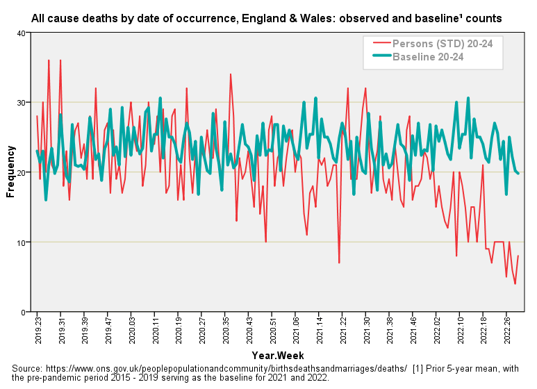 Anecdotal evidence points to delays of several weeks and sometimes several months but we’re talking the best part of a year. Is this simply a function of delays incurred through post-mortem of younger cadavers or is something else more sinister going on? Is the ONS deliberately trying to paint a rosy picture of modest death in the experimental gene therapy era? We’ll probably never know and I’m not sure the ONS will ever know! Officers I’ve spoken to are very helpful indeed and advise caution against using death data less than 6 months old.