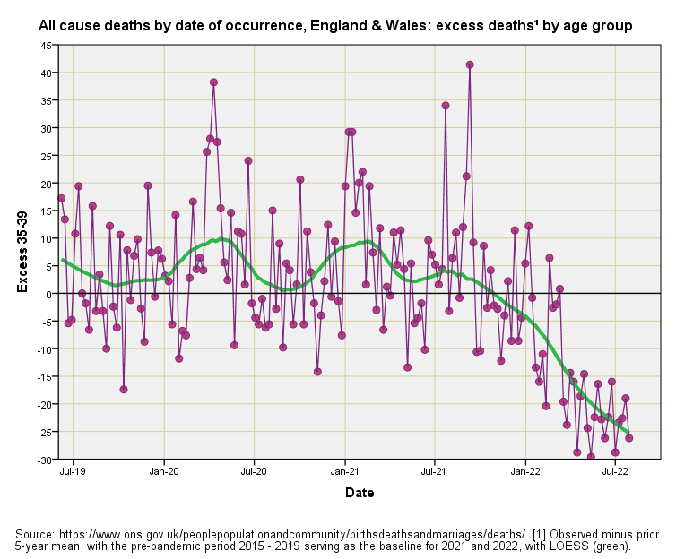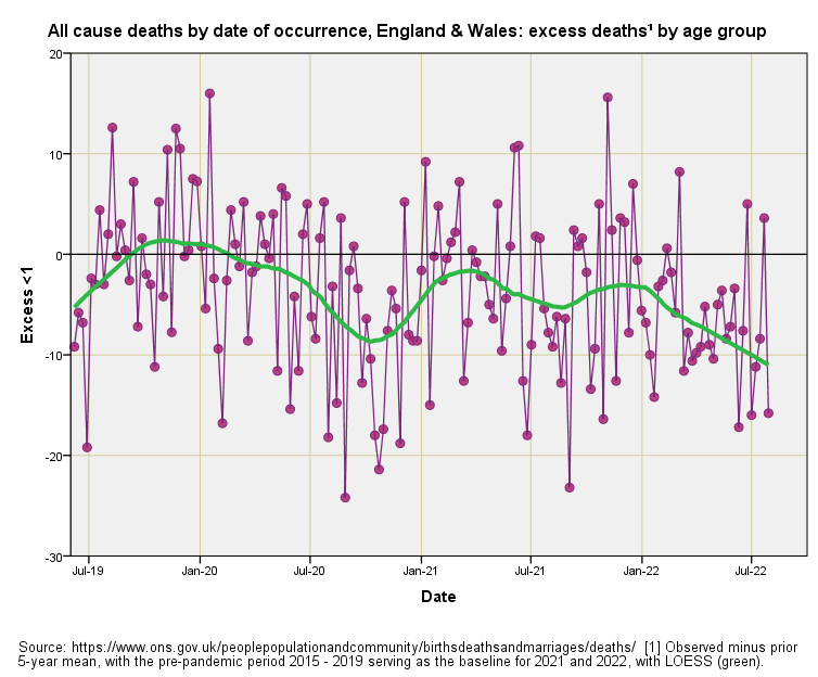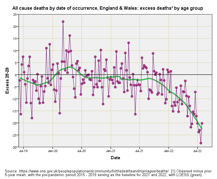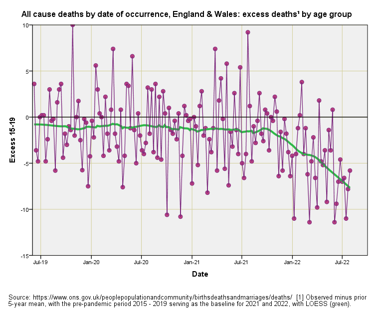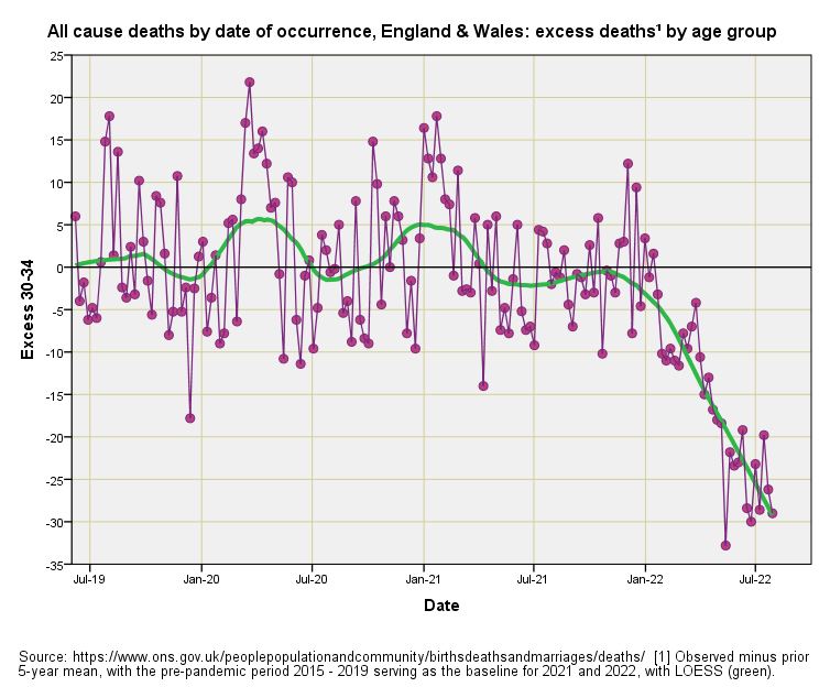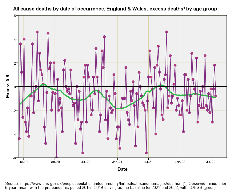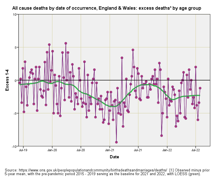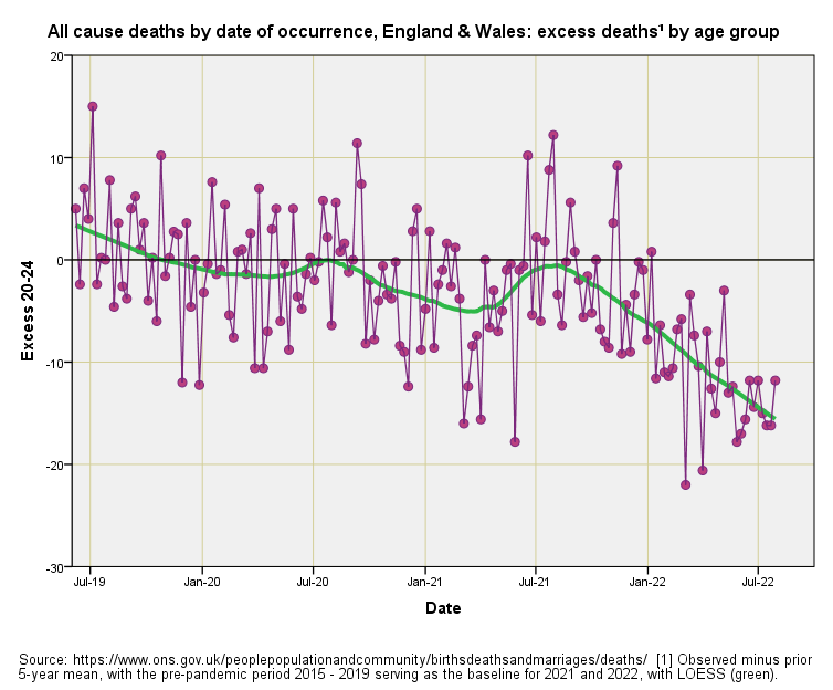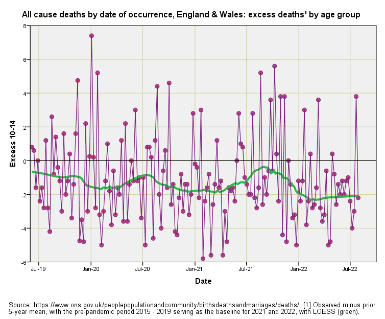 Meanwhile, I have derived excess all cause deaths by date of death (DOD) using Joel’s FOI data and using the ONS standard method of subtracting prior 5-year means for each of the 20 quinary age groups. I now present them as an uninterrupted breakfast feast that should be self-explanatory save for a locally-estimated scatterplot smoothing function (LOESS), this being depicted by a green wiggly line that guides the eye.