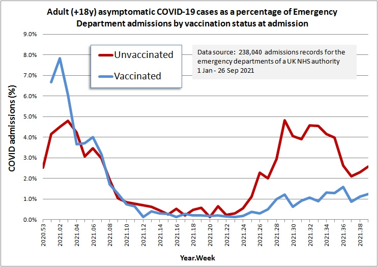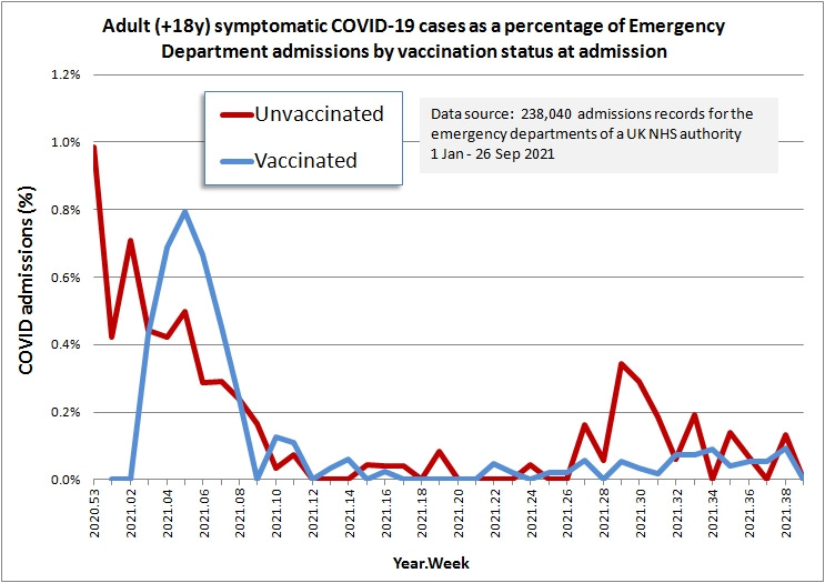 Just before my break from analysis I prepped a rather large file of emergency admission EPR data for an undisclosed UK NHS Trust covering the period Jan – Sep 2021. There’s all manner of detailed analysis that can pop out of this so I cogitated on what slides people would likely want to see first and foremost. I decided to address the issue of vaccinated vs. unvaccinated emergency COVID admissions.