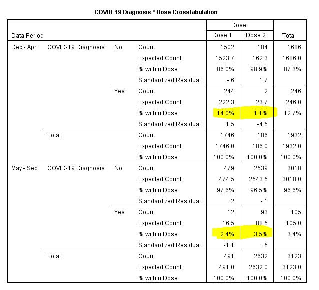 Whilst unravelling the many biases that need to be accounted for before getting stuck into modelling vaccine benefit/disbenefit I thought I’d double check matters by considering the advantages conferred from full vaccination. By that I mean we should see dose 2 reducing the incidence of in-hospital COVID death compared to dose 1, and especially for the period May – Sep when full dosing of the UK public was well underway and immunity presumably in full swing. Makes sense, right? Following the science, right?