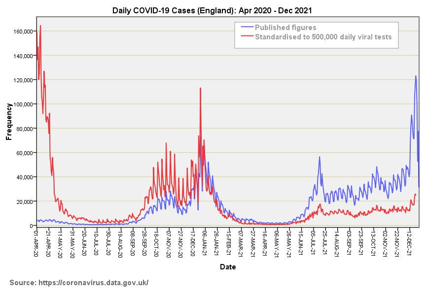 Over the period 30th Jan 2020 – 27th Dec 2021 the grand daily mean for test activity in England under pillar 1 and pillar 2 schemes fetches up at 532,799 tests per day. This prompted me into standardising COVID-19 case counts for a nominal test rate of 500,000 tests per day and comparing this curve with the published figures. Obviously there are many assumptions made here, but that is pretty much par for the course for any diagram we gaze upon!