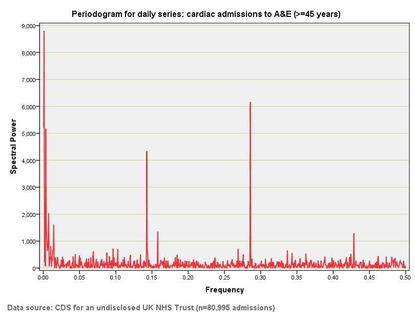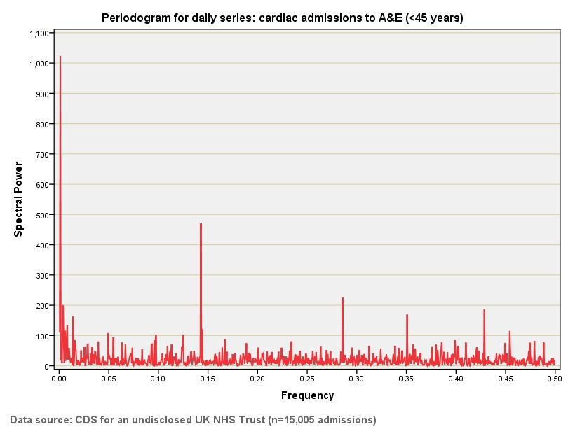 Figure 1: The first thing to note here is that great big red spike at a frequency just above zero. Its frequency is λ≈ 0.00115, which tells us there is a very long periodic component represented by an 868 day cycle or thereabouts. This equates to 124 weeks or around 28.5 months or around 2.4 years and means there is a long term trend in admissions for cardiac cases <45y. Of interest is the spike sitting at λ≈ 0.1429 – a figure we have just met! This represents a 7-day cycle for such admissions. There are a few small spikes beyond this that represent high-order harmonics of 2 – 3 days, almost as if good day-bad day flip-flops along.