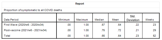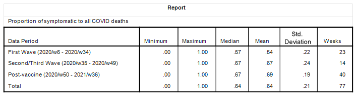 Bizarrely, we observe the highest mean rate post-vaccination rollout (69%) and the lowest mean rate during that rather strange first wave (54%). If the SARS-COV-2 virus was mutating into more virulent but less lethal strains as claimed then this may explain matters, at the same time indicating that the phrase ‘COVID death’ is pretty much meaningless. Then again the highest rates for symptomatic COVID death in the rollout period point a bony finger of suspicion at the vaccines – aren’t they supposed to be alleviating severity?