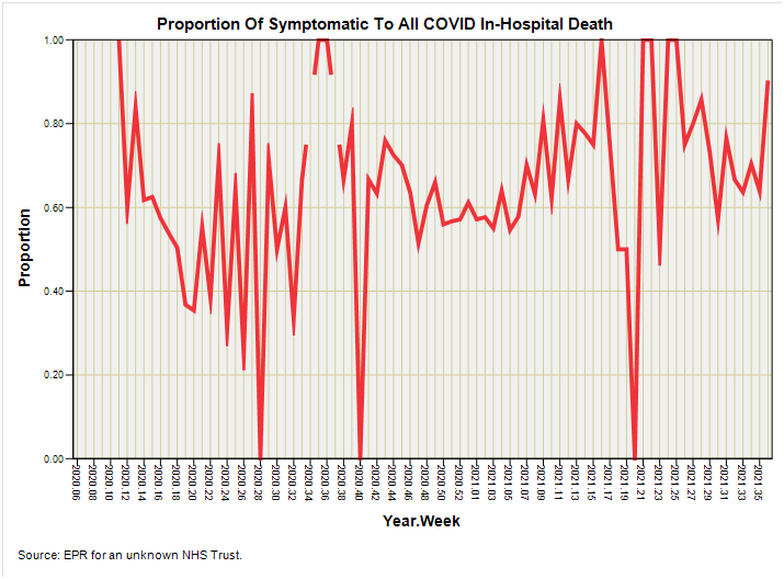 This morning I am going to bolt on a few extras to this series that had skipped my mind, starting with an apology to Joel Smalley for not flagging up his contribution dated as far back as 10 June 2020 entitled The Collateral Damage Of The UK’s Response To COVID-19. If anybody has been on the case throughout this global fiasco from day one then it is Joel and if you’re not reading his words then you should. He doesn’t mince them or dress them in fancy filo like I am wont to do! Joel also suggested that I look at the ratio of asymptomatic to symptomatic COVID in-hospital death, so without further do here is a slide that does something similar:
