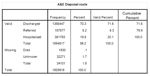 We can take the same KISS approach with disposal route by boiling down the various options into just three basic categories: discharged; discharged with referral; hospitalised. Here’s how the numbers look: