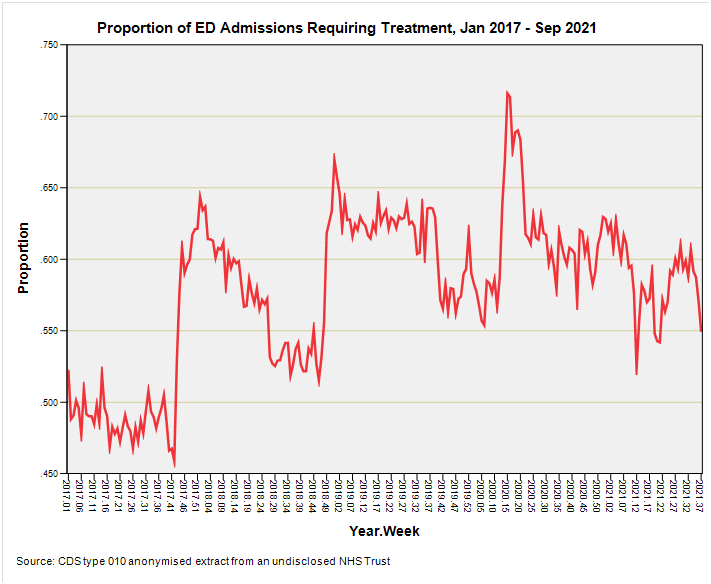 Some folk might prefer I look at deaths within the department as a clinical outcome but since these amounted to just 1,830 cases out of 1,928,918 admissions (0.09%) for the entire period January 2017 – September 2021 then I’m not going to be able to do very much fancy fiddling on the statistical front, so shall put this idea on the top shelf in the pantry for the time being.