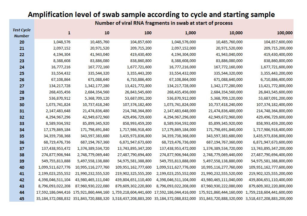 Let us suppose it takes 1 billion UV-tagged DNA chains to trigger a positive RT-PCR test result and the polymerase chain reaction process follows a perfect doubling. If we start with a swab containing 1 viral RNA molecule we'll hit that detection threshold in 30 test cycles. If we increase the initial sample to 10 viral RNA molecules we'll hit detection at 27 test cycles. With 100 viral RNA molecules on our swab the Ct drops to 24 cycles. With 1,000 viral RNA molecules on our swab the Ct drops to 20 cycles, and with 10,000 viral RNA molecules the Ct drops to 17 cycles (slide #1).
