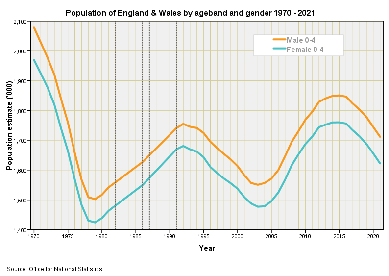 I’m quite pleased with this. Straight away we can see more males than females are born each year and this ratio hasn’t changed that much over a span of 52 years. Over on the far left we observe the residual of the baby boom of the 1960s coming to an end by 1979, only to kick-off again the produce the millennials. I hadn’t appreciated a third birth peak (Generation Z / Generation Alpha) but there you go, here it is in orange and sea green!