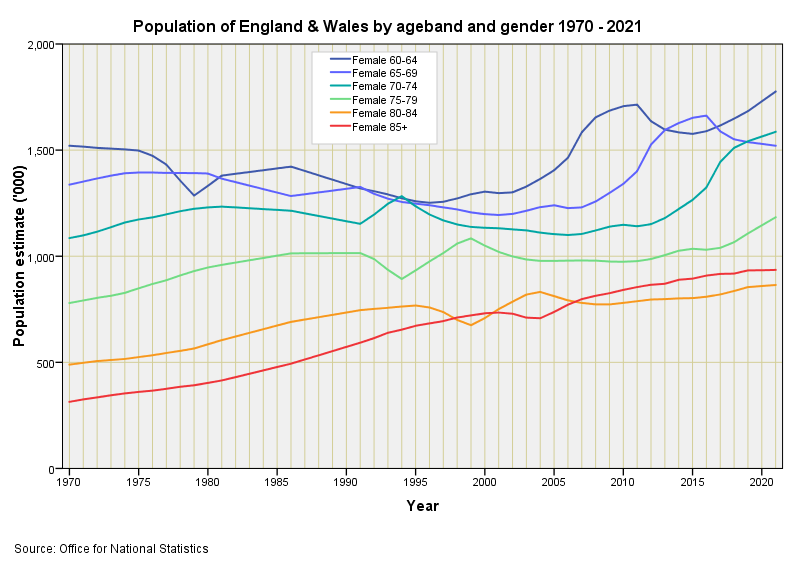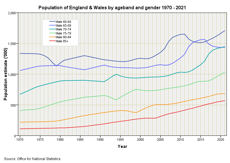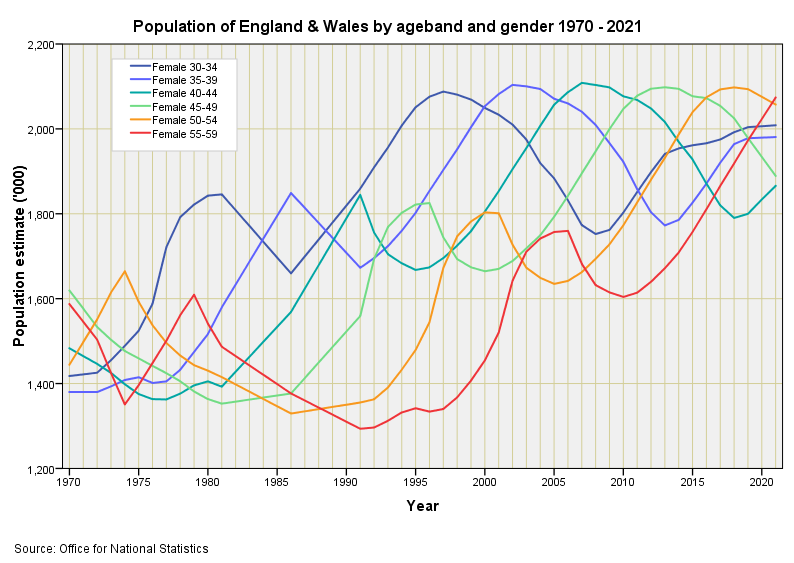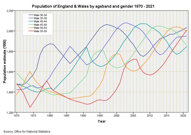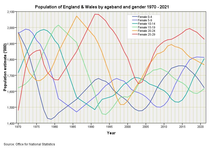Yesterday I summarised my efforts to obtain population estimates by quinary age band (5-year) from zero upward by sex by year going all the way back to 1970, explaining how this information wasn’t sitting on a shelf somewhere despite it being pretty basic stuff. This morning we are going to take a look at some rather interesting population trends.