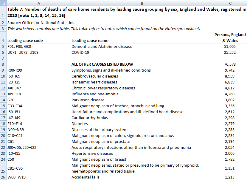 A clue as to what they might have been is provided in tables 7 and 8 of a jolly useful spreadsheet entitled Deaths in the care sector, England and Wales. Table 7: Number of deaths of care home residents by leading cause grouping by sex, England and Wales, registered in 2020 is rather tasty, enabling us to add columns to produce a grand total of persons by leading cause then sorting this by frequency of mention on the death certificate. Here’s a screenshot of my fiddling…