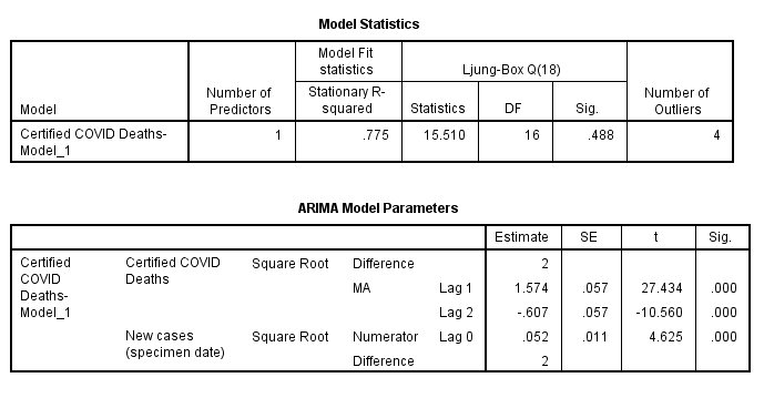 The good news is that new daily case counts made the grade as a highly statistically significant predictor variable for certified death (p<0.001). Herewith the tabular heart of the modelling run: