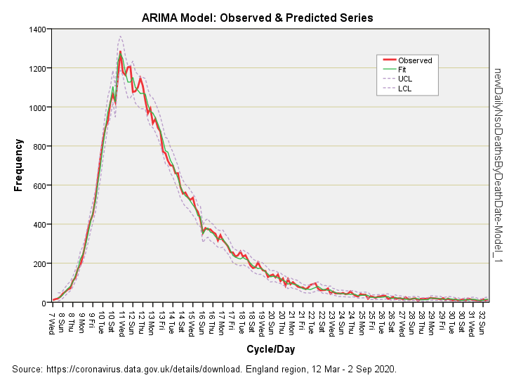 Each slice may well require a different ARIMA model structure and this will provide useful insight. Obviously I can’t assess the impact of vaccines in the first segment and neither can I assess use of lateral flow devices but what I can usefully do is assess daily case count as an independent predictor of COVID death.