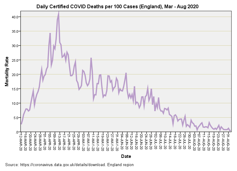 In terms of crude daily mortality (certified deaths per 100 cases) the series looks like this:
