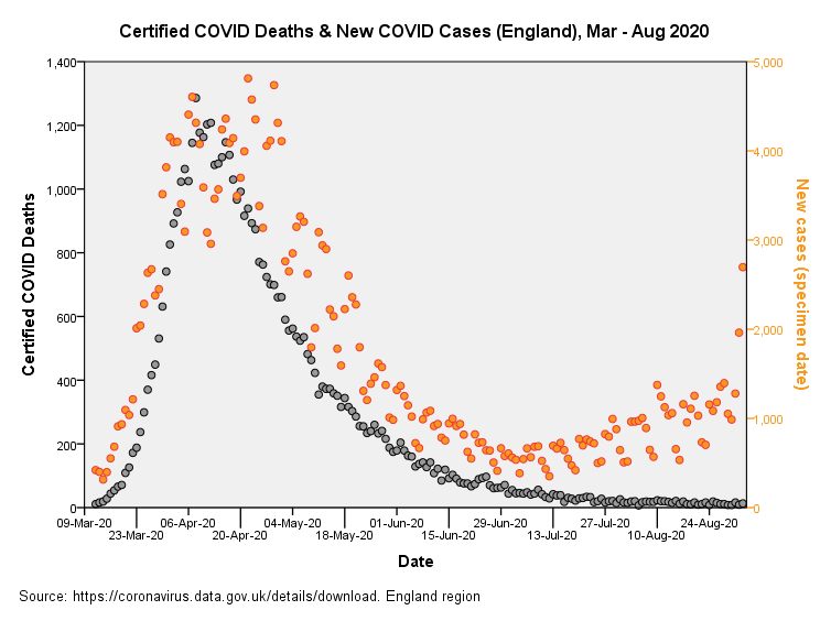 At the outset we see case counts rise before deaths but there comes a curious point during April 2020 when we observe a peak in deaths corresponding to a dip in cases. Toward the end of this slice the case counts rise as the testing regime goes nuts, with death dwindling to single figures.