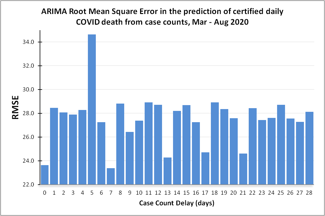 That weeny blue bar at a delay of 7 days reveals the ARIMA model for linking case counts to certified deaths is doing the very best job of squeezing the juice when we allow a 7-day delay from test result to death. There are a few other low value bars revealing life (or death) isn’t that simple.