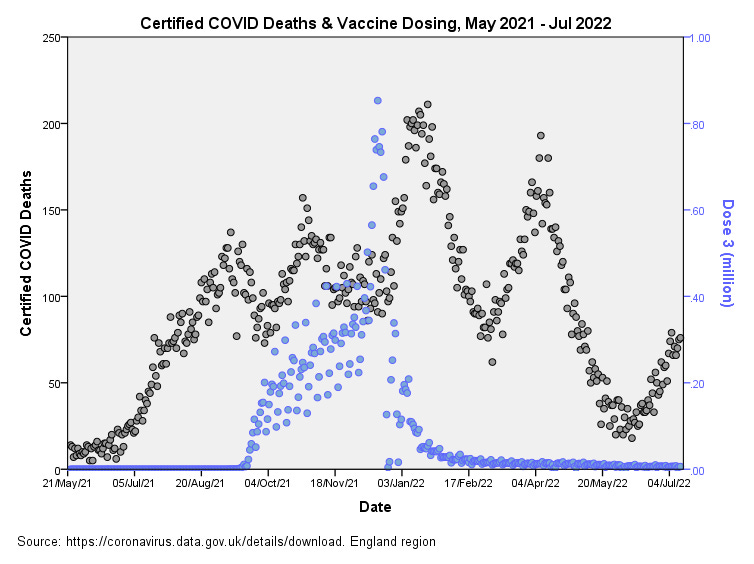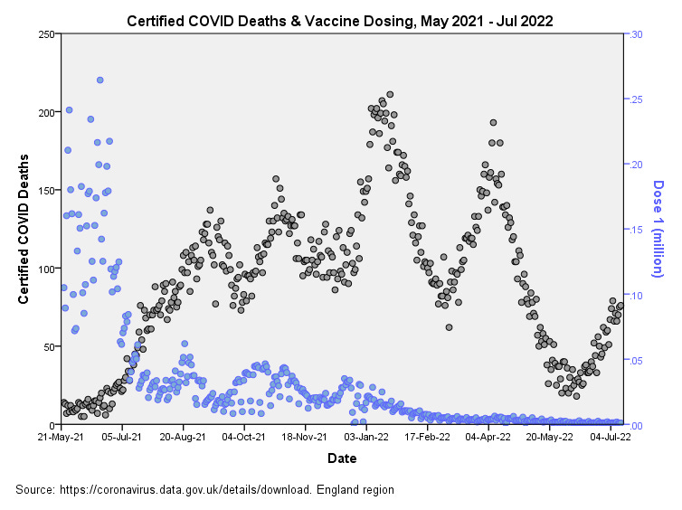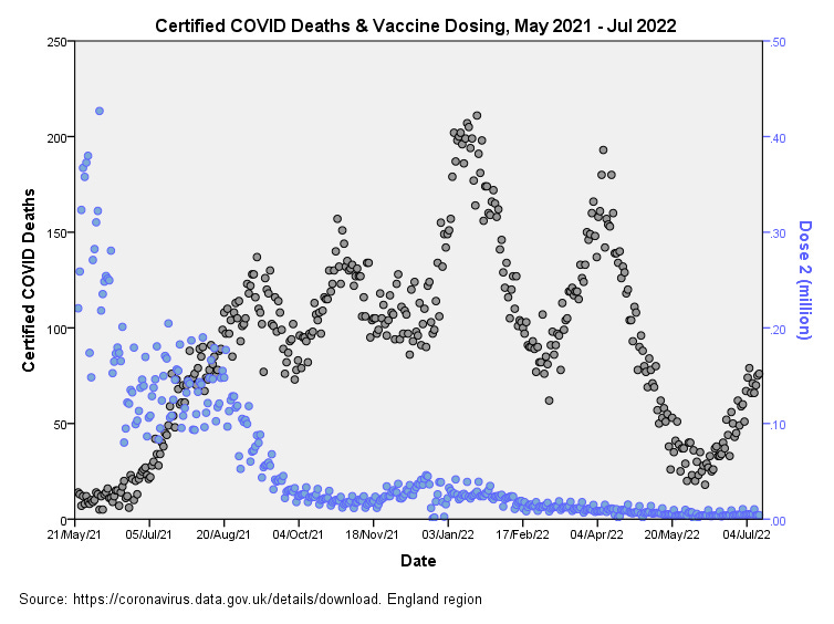 There’s not much by way of correspondence for dose 2 apart from a bit of a hump in late dose 2 uptake and the hike in summer COVID deaths following a lag of around 6 weeks.