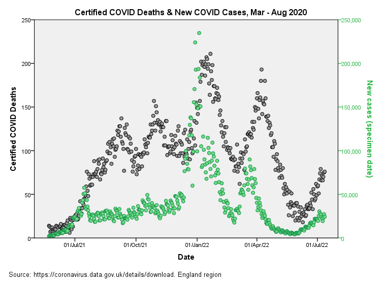 Now that is the strangest time series for deaths I have ever seen! In addition to the expected 2021/22 winter peak we’ve got a summer peak, autumn peak, spring peak, and what appears to be the beginning of a second summer peak. Assuming these deaths were appropriately certified by experienced physicians working according to training rather than management whimsy, and assuming emphasis hasn’t been placed on test results, then we may conclude that we’re looking at a strangely cyclic catastrophe.