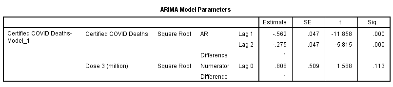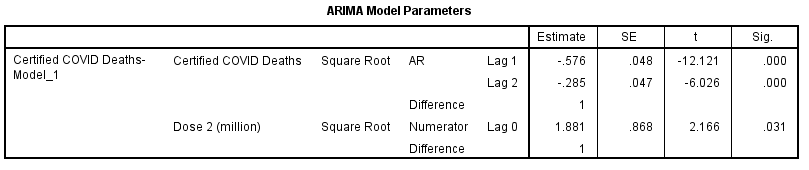 The second dose is a little shy in coming forward, reaching a p-value of p=0.031. I didn’t expect anything from the second dose so this was a pleasant surprise! As we may have already gathered the effect size is pretty small with R-square = 0.015; that is, 1.5% of the daily variation on certified death can be explained by variation in secondary dosing.
