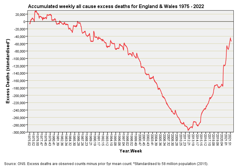 There are a number of ways to get a handle on this and I decided to set out by looking at accumulated weekly all cause excess death. The following slide is worth deep cogitation with a cuppa for it acts as a proxy for the general health of the nation. If nothing ever changed (no seat belt laws, no technological progress, no wonder drugs etc) then we’d expect the red line to bob about the zero value on the y-axis. It certainly does this up to 1987, from which point onward we see a general improvement as we slide into ever increasing negative excess.