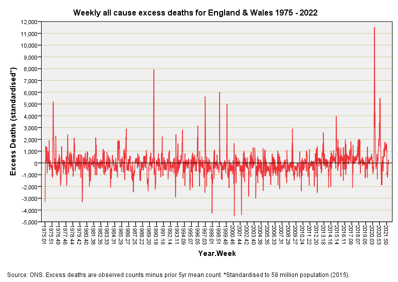 With these issues swilling around our bowl let’s take a look at weekly all cause excess death for England & Wales for the period 1975/w2 to 2022/w13:
