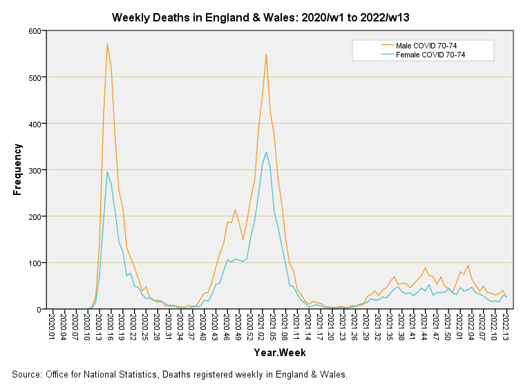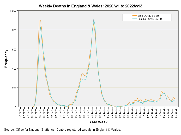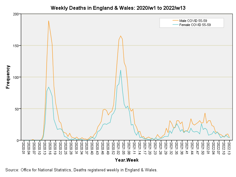 Herewith the final set of slides, being COVID deaths for those aged 50 years and over across England & Wales for the period 2020/w1 to 2022/w13. There’s nothing much to see here other than the well-established initial peaks and preponderance of male deaths but I include them for the sake of completeness…