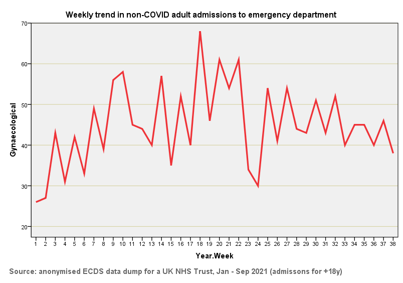 We observe a significant rise in cases from week 1 (w/b 2 Jan) to week 19 (w/b 8 May) and a most curious decline thereafter. Not having access to historic data it is difficult to determine how much of this may be ascribed to natural cycles or whether the average intake of 44.9 cases per week is considered typical.